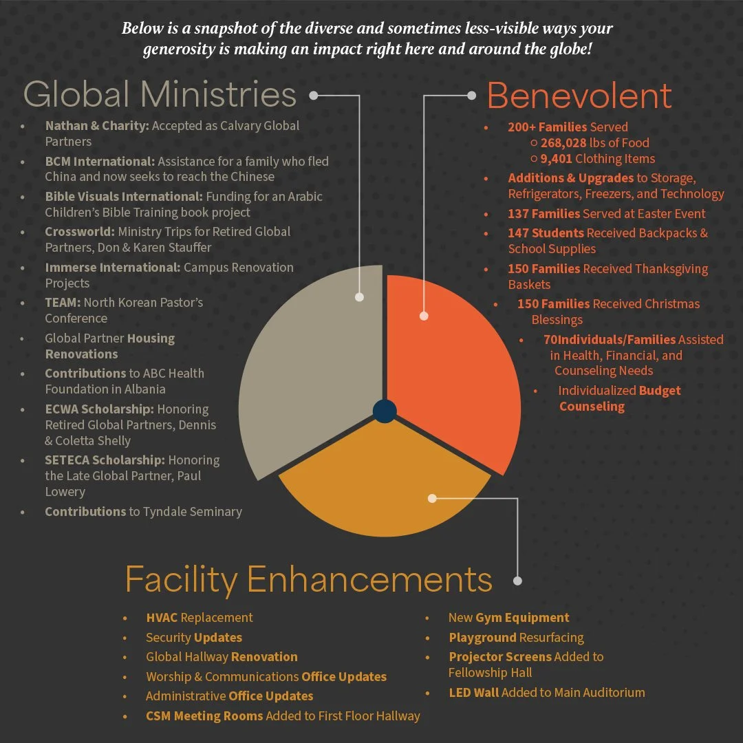 The Apostle Paul writes in 1 Corinthians 3:6, “I planted, Apollos watered, but God gave the growth.” As you read through this Impact Report, you’ll see clear evidence of that truth: faithful planting and watering by so many in our church family, resulting in God bringing growth in people’s lives. This report is way more than a summary of ministry activity. It’s a celebration of life transformation. It’s a glimpse into how God is working through His church—how He is moving in the lives of children, students, adults, and families—both here and around the globe. And it’s a reminder that behind every story, every baptism, every short-term trip, every worship service, every retreat there is someone like you who chose to serve, give, pray, or step out in faith.